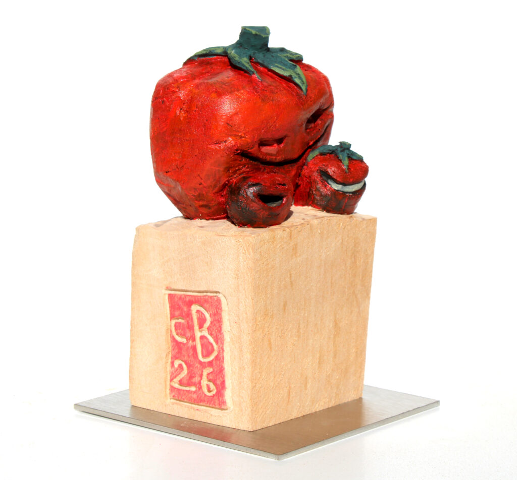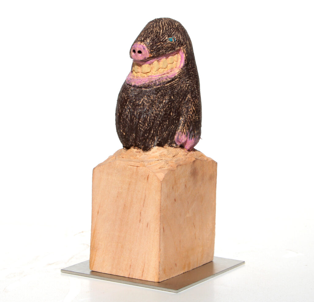 Erlenholzskulptur; Buntstift; Lack; Bodenplatte aus Metall